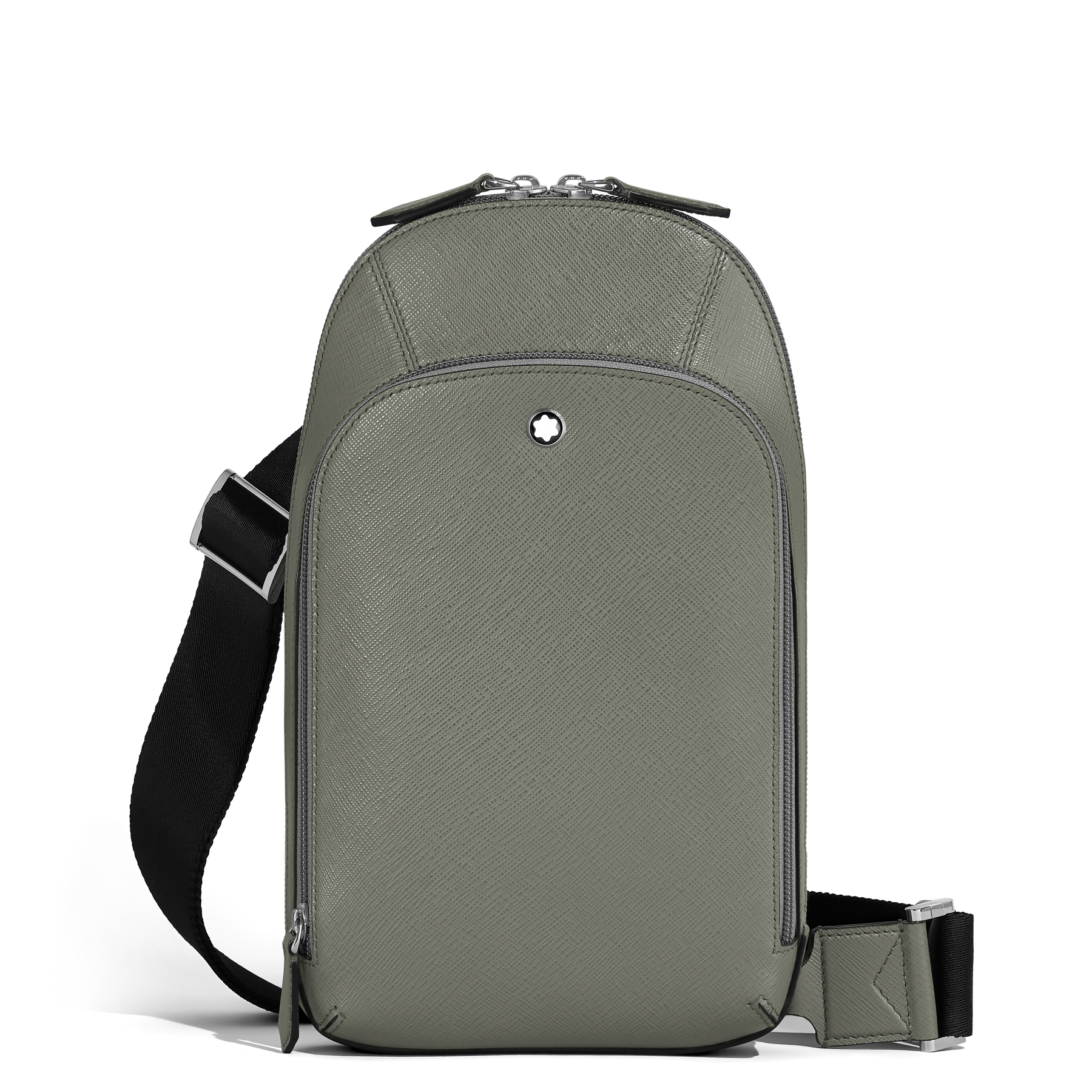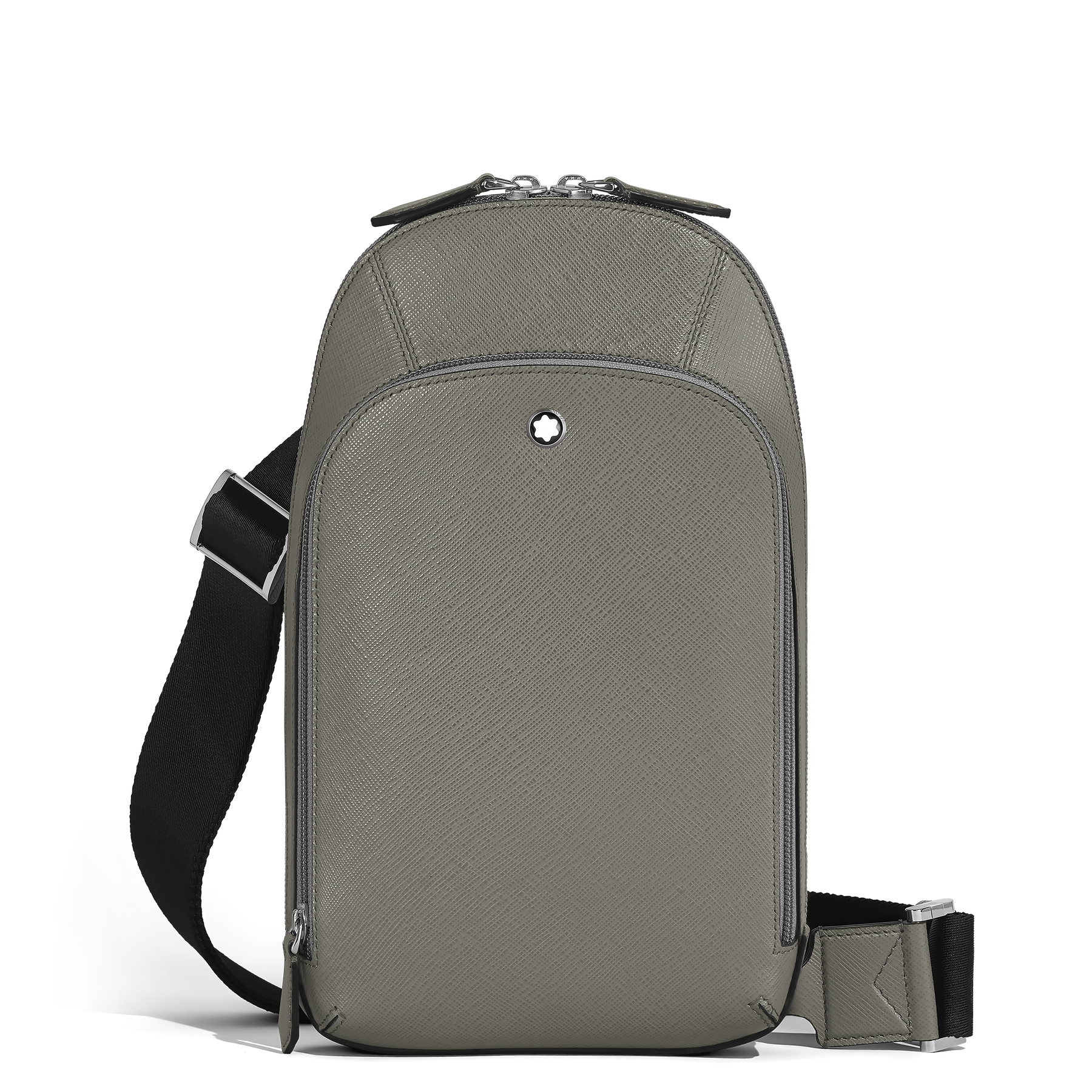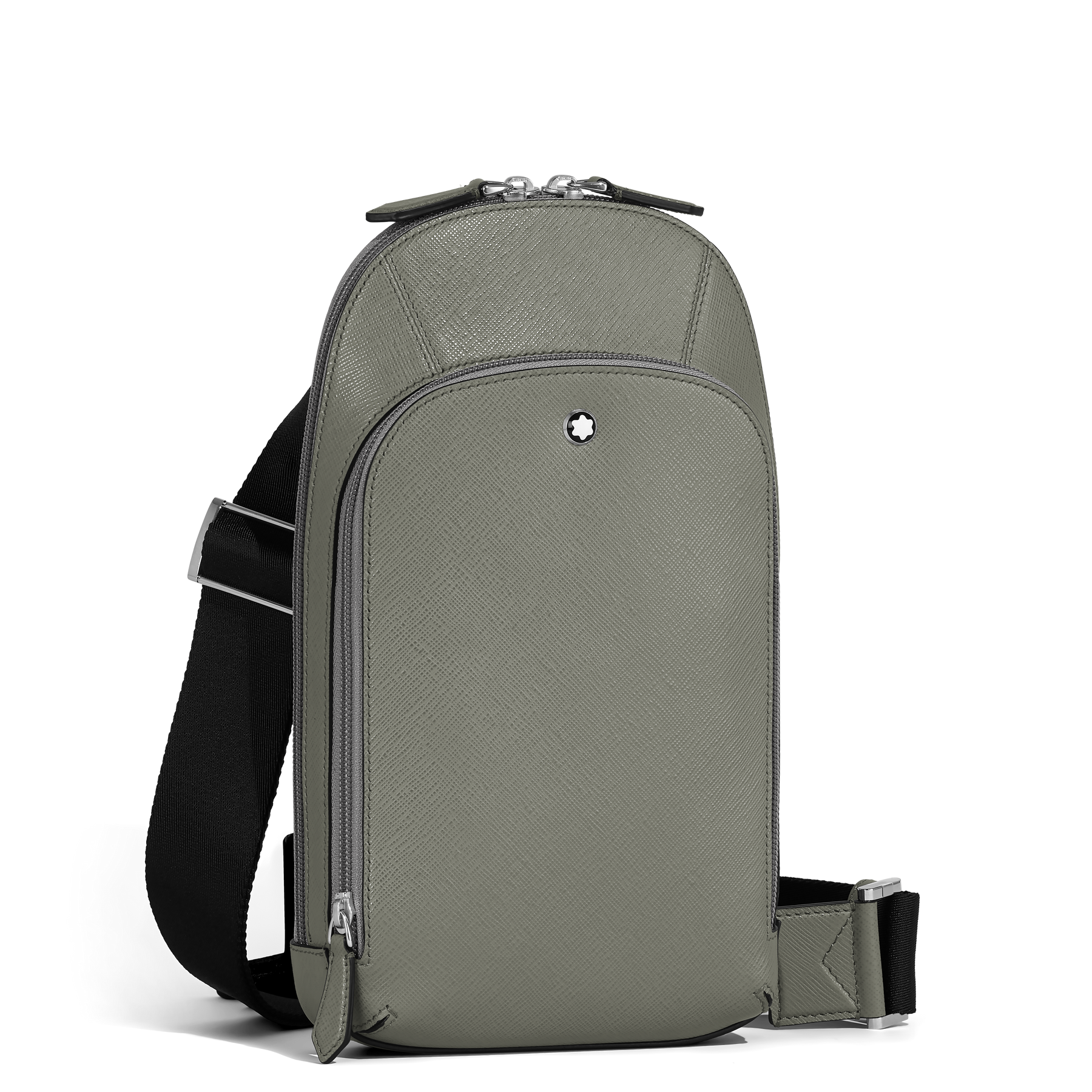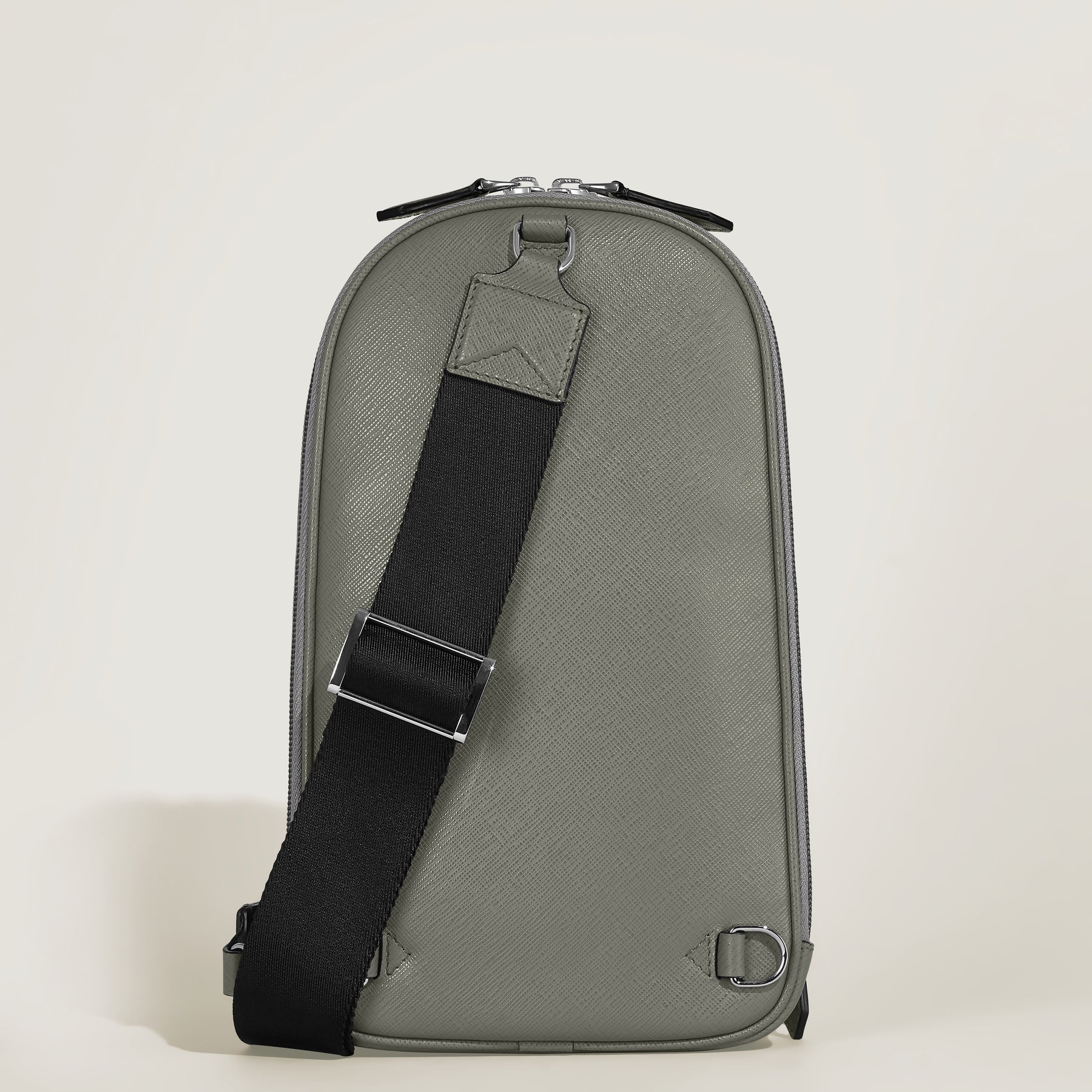 The new Sartorial sling bag, crafted from elegant medium grey Saffiano-embossed leather, is for adding a touch of modern casuality to your everyday look. This functional accessory features a secure zip closure and an adjustable shoulder strap for comfort. It offers a spacious main compartment, an internal zipped pocket for valuables, and external storage including a zip pocket, three open pockets, and slots for three credit cards.