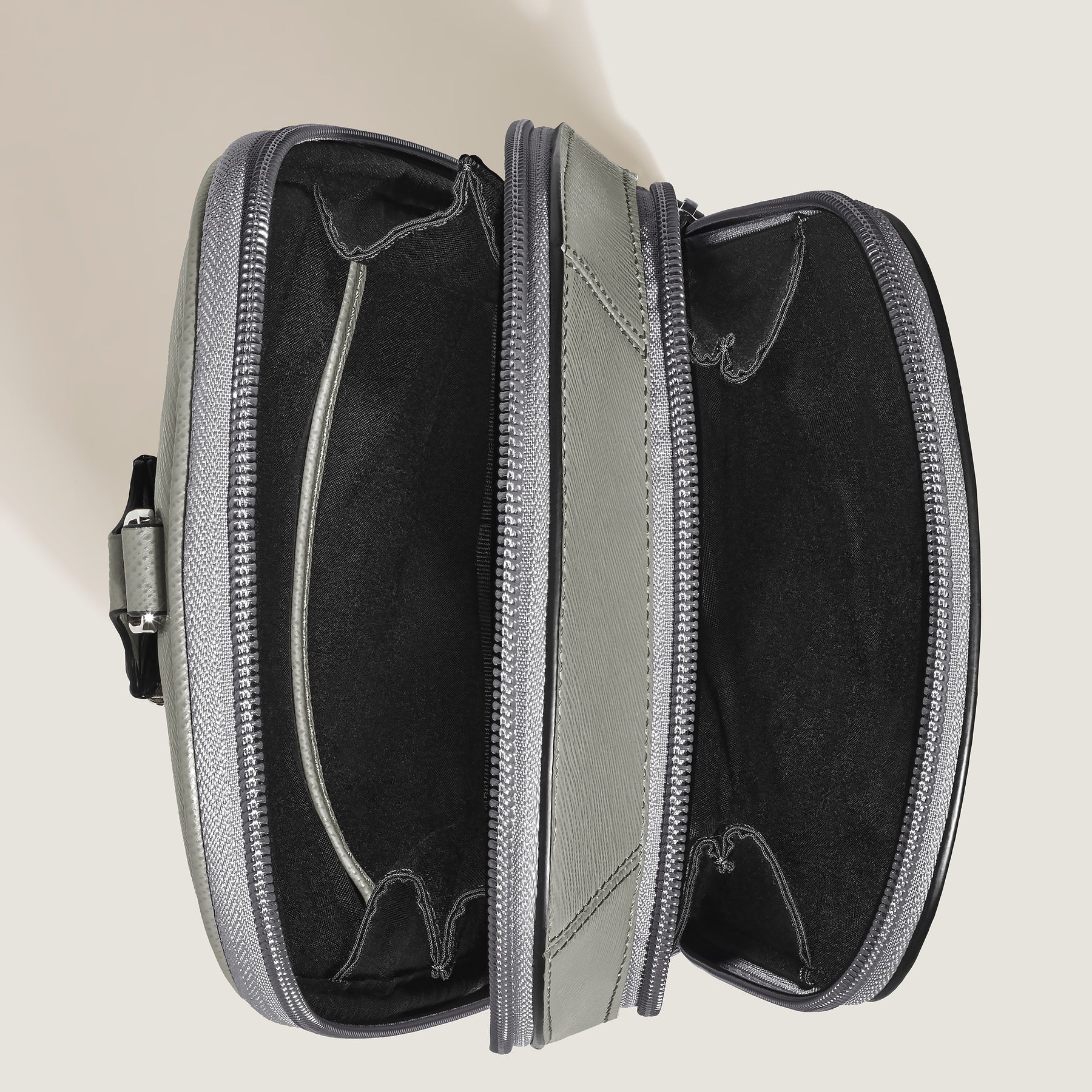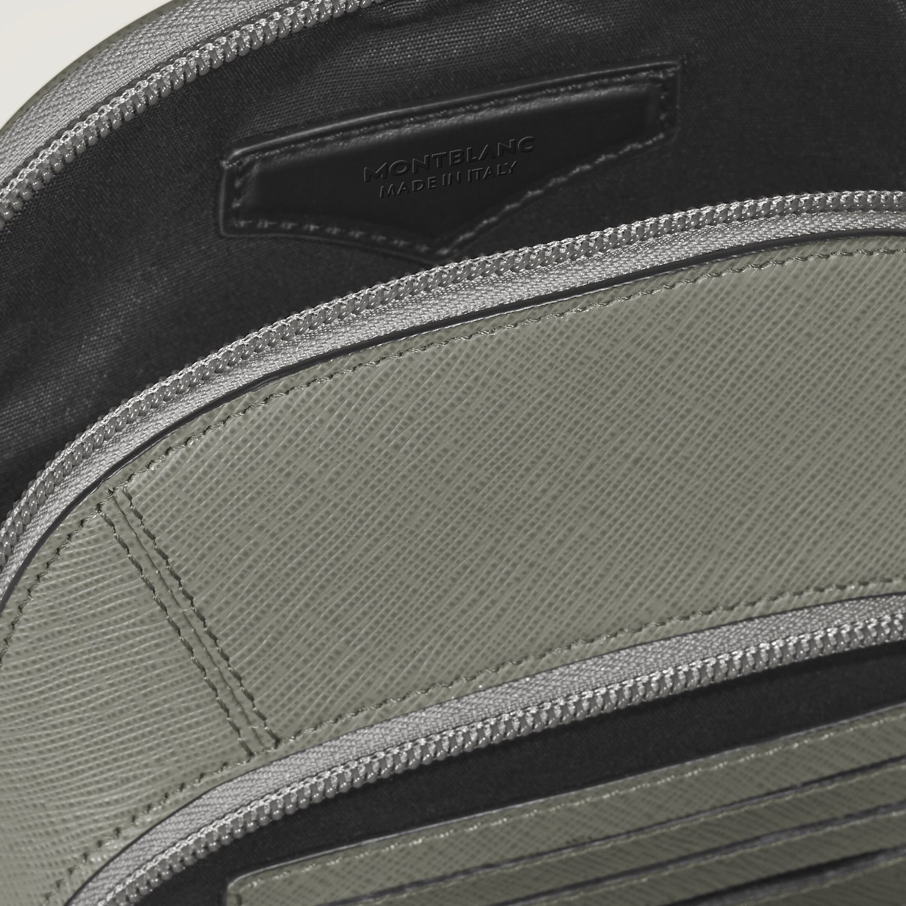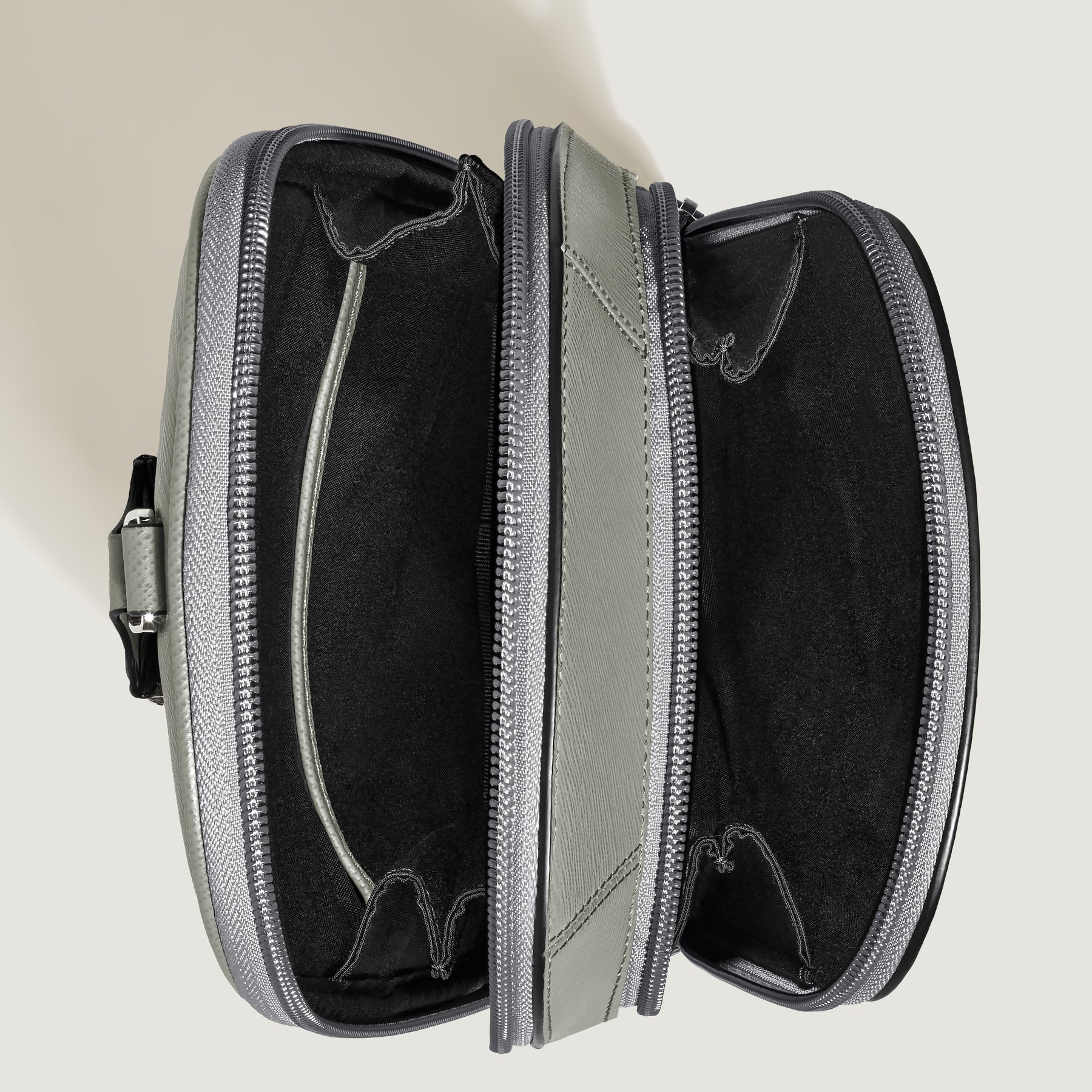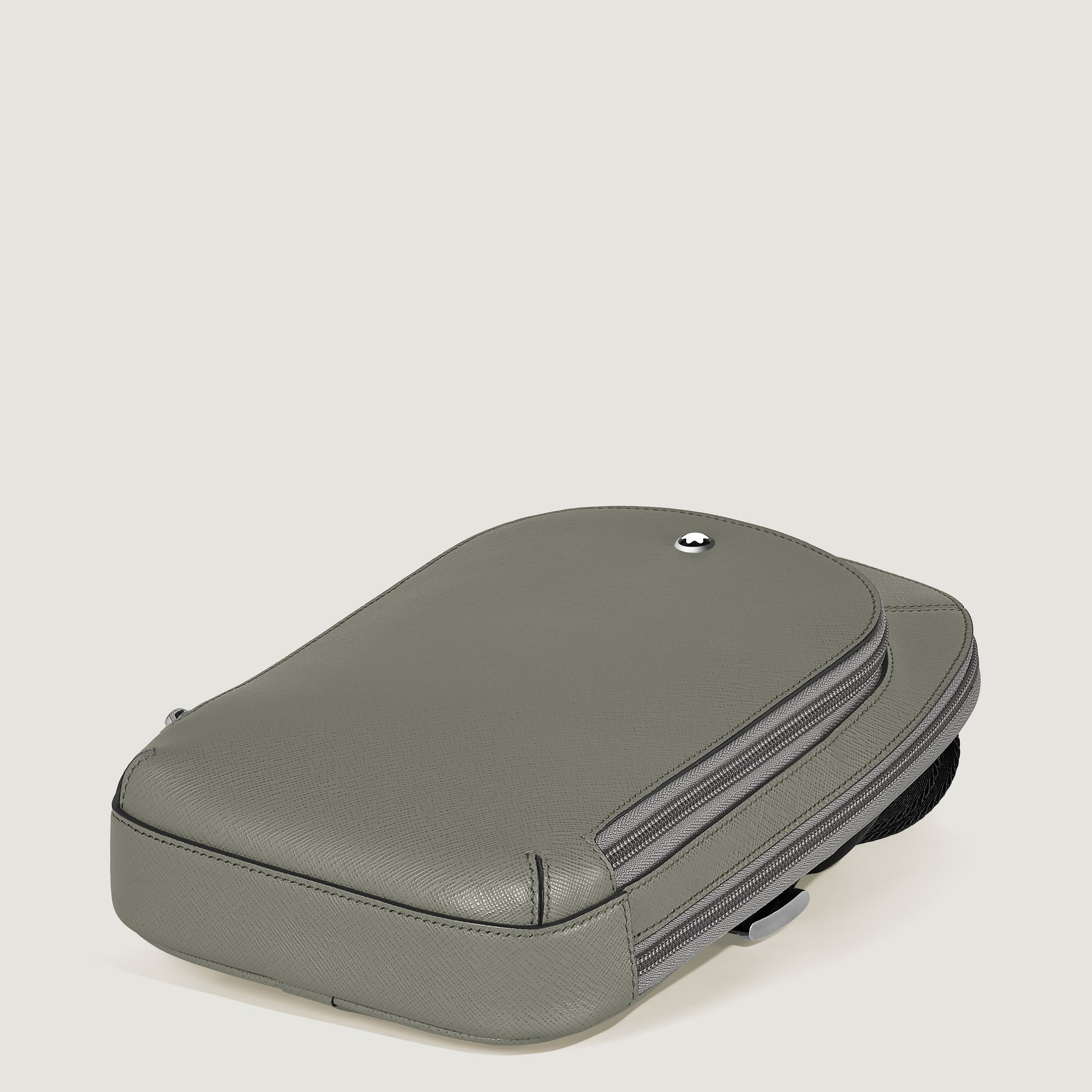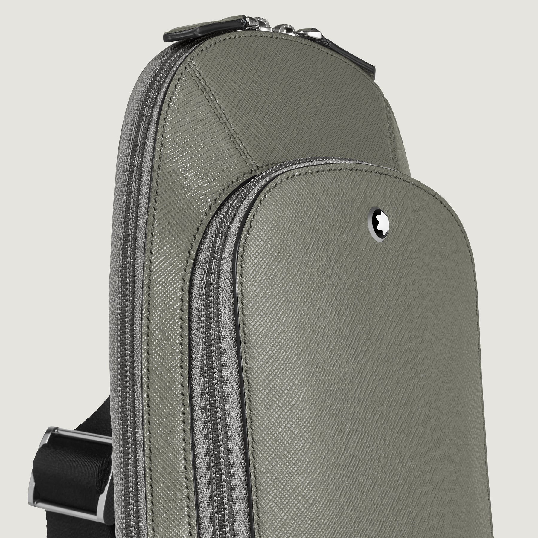 The new Sartorial sling bag, crafted from elegant medium grey Saffiano-embossed leather, is for adding a touch of modern casuality to your everyday look. This functional accessory features a secure zip closure and an adjustable shoulder strap for comfort. It offers a spacious main compartment, an internal zipped pocket for valuables, and external storage including a zip pocket, three open pockets, and slots for three credit cards.
