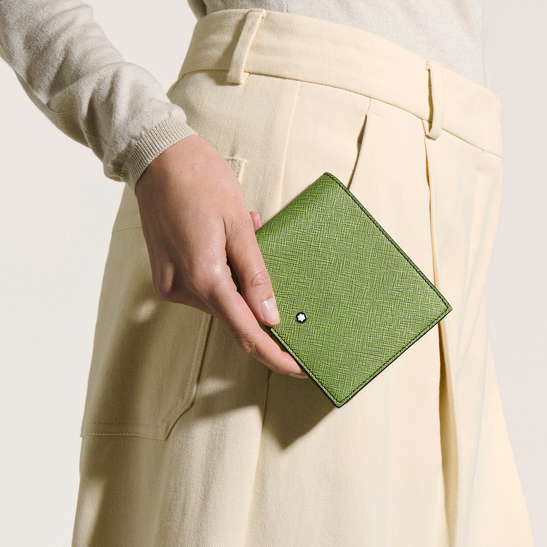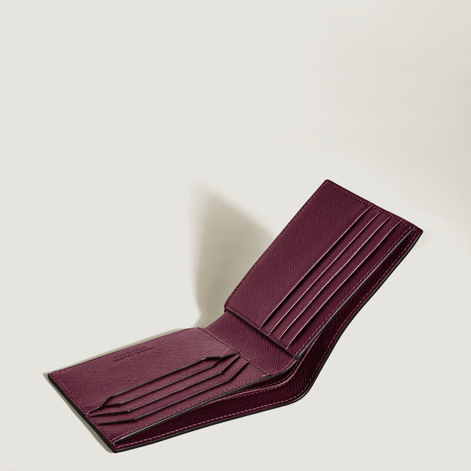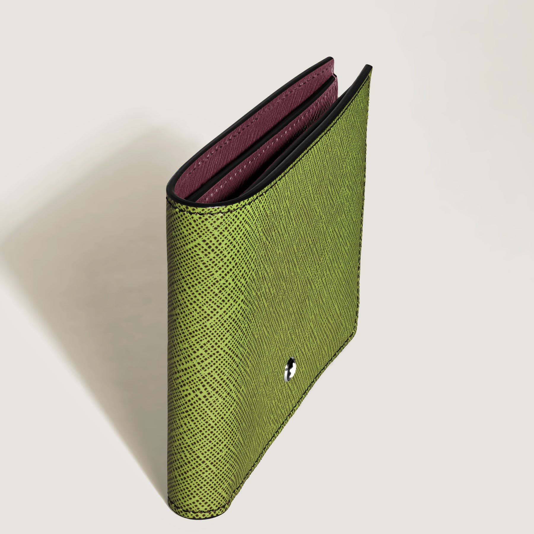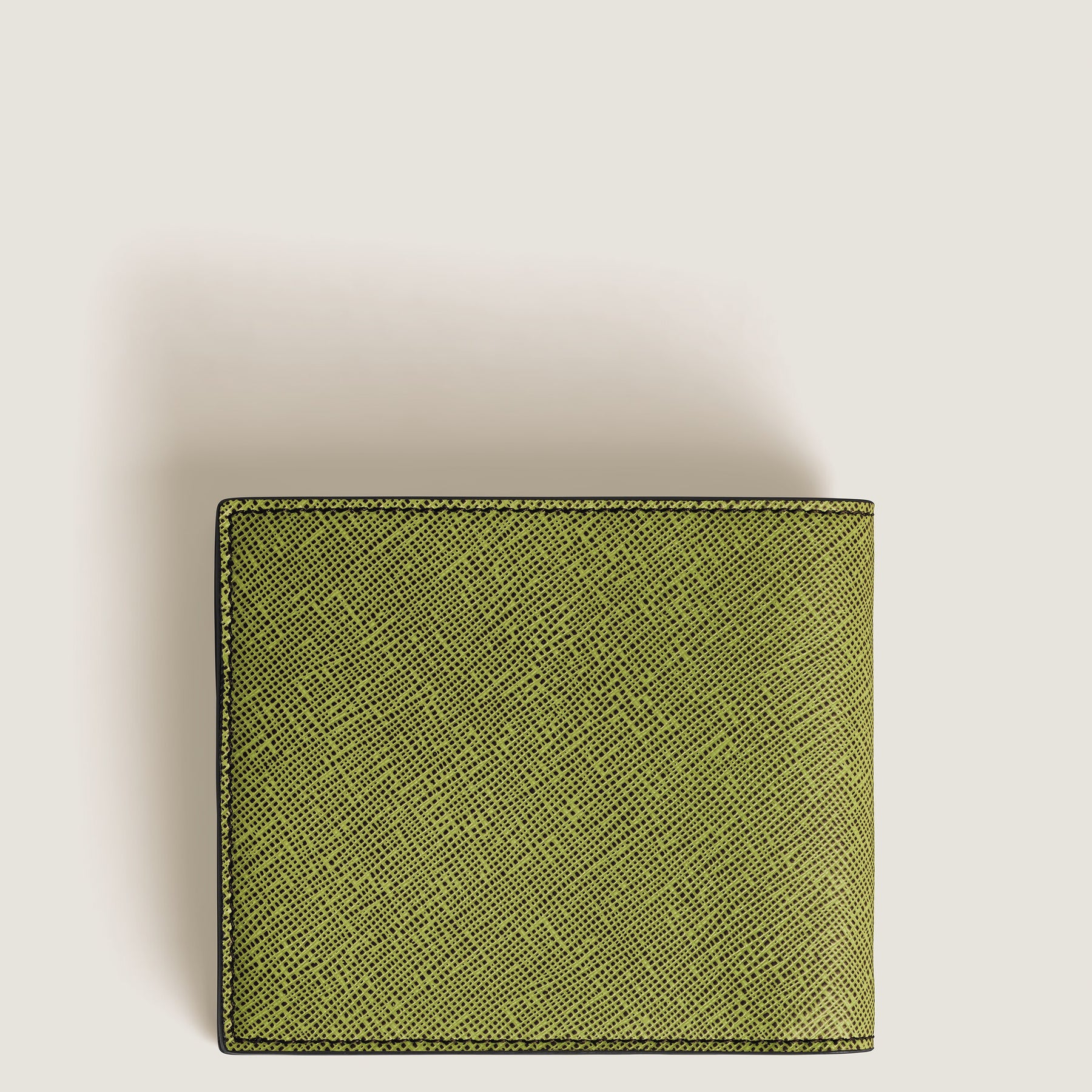 A practical accessory with the refined look of a modern classic, this Saffiano-printed wallet can accommodate up to eight credit cards with dedicated slots. Its sleek, compact silhouette subtly accommodates further storage in the form of two banknote compartments and two additional pockets. Beyond its sophisticated exterior in multilime, its interior offers a surprising colour pop through a cassis-coloured leather.