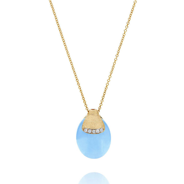 A refined 18kt gold and milky aquamarine pendant crowned with an elegant diamonds detail. The sophisticated gold workmanship plays with light, reflecting it suggestively, and embraces the precious stone like a shell, sealing the encounter between Nature and craftsmanship. Ref. CS3-587 Chain lenght 42,50 cm