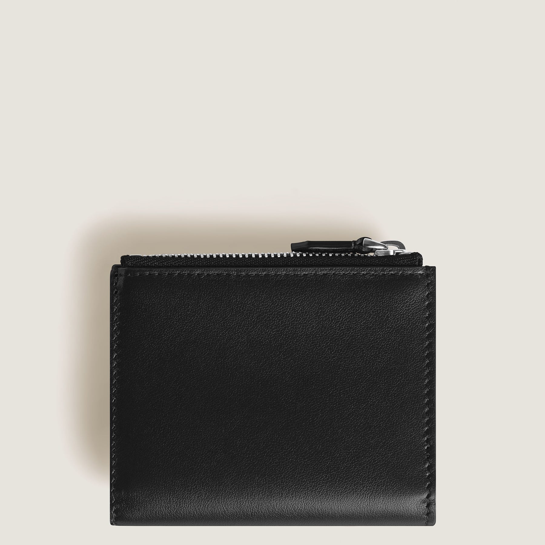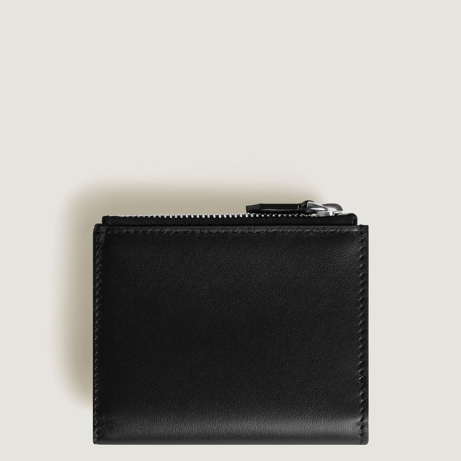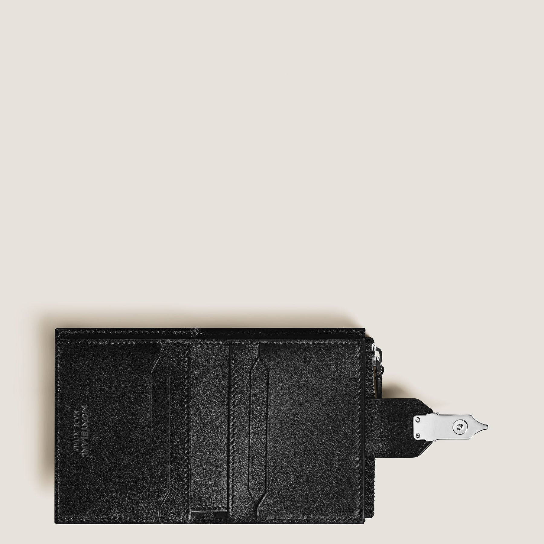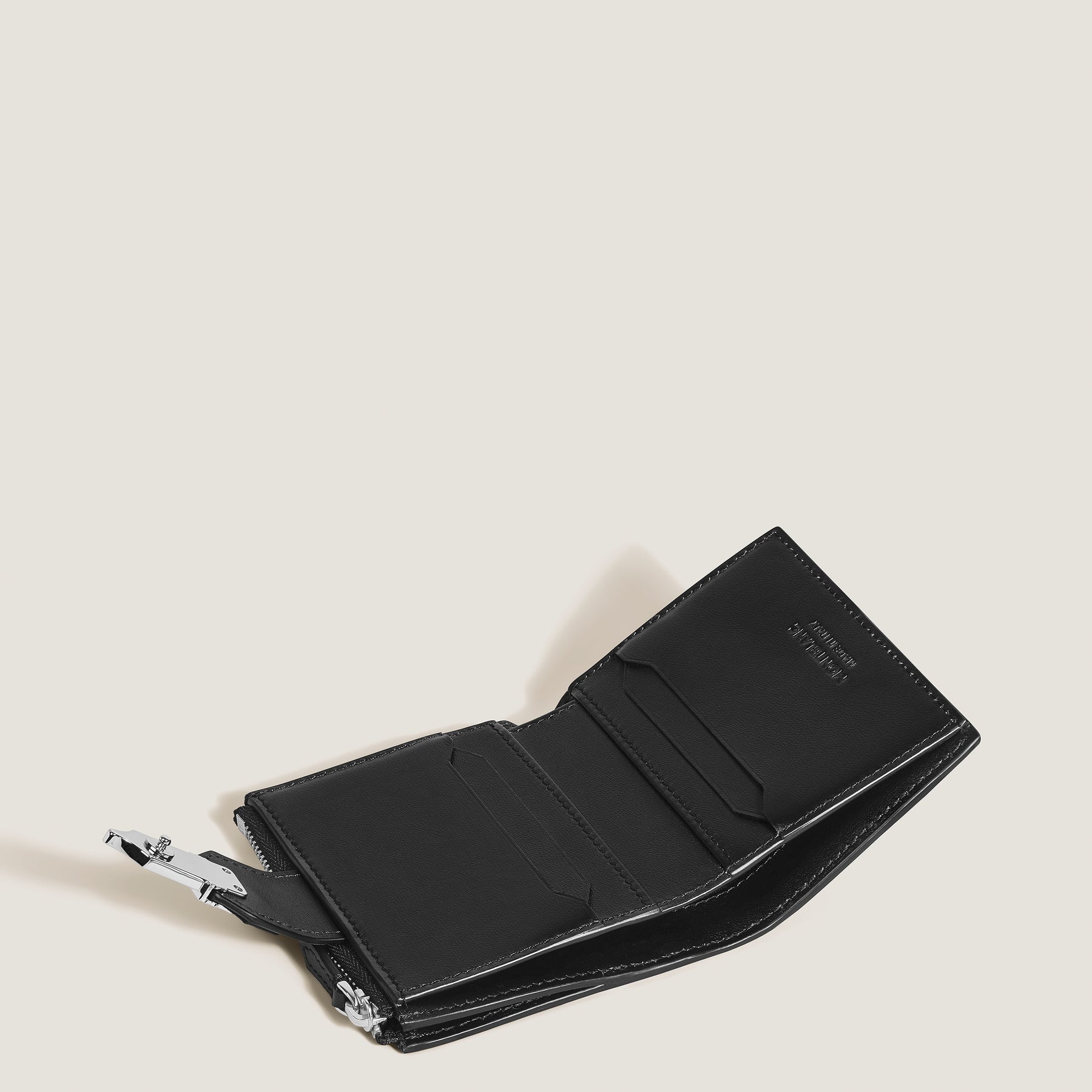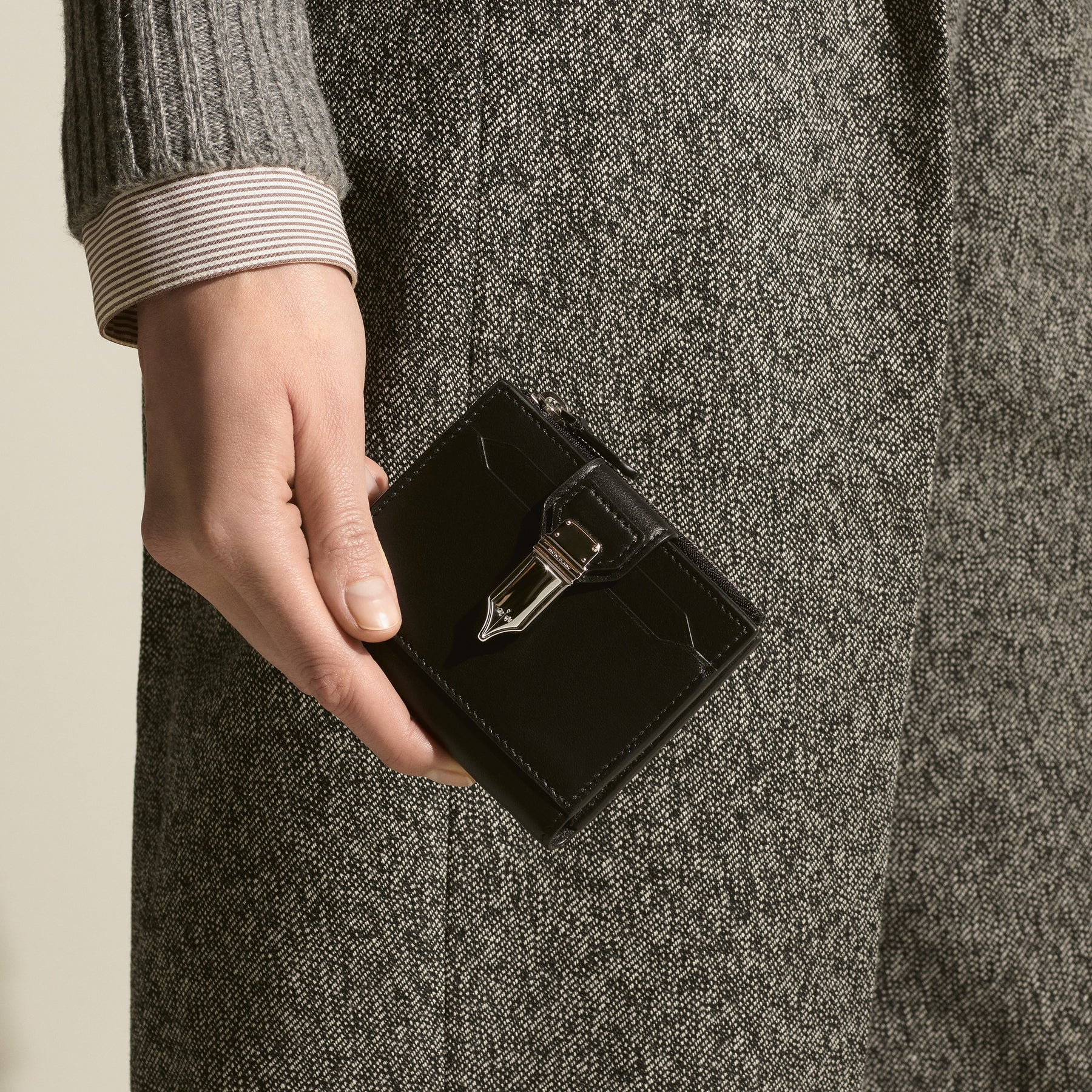A rightful companion for daily use, this wallet boasts fits into every pocket. Crafted from soft black leather, it's accented with a unique, nib-shaped metal closure. Functional and stylish, it offers slots for six credit cards, a compartment for banknotes, a zipped pocket for coins, and two additional pockets for your convenience.