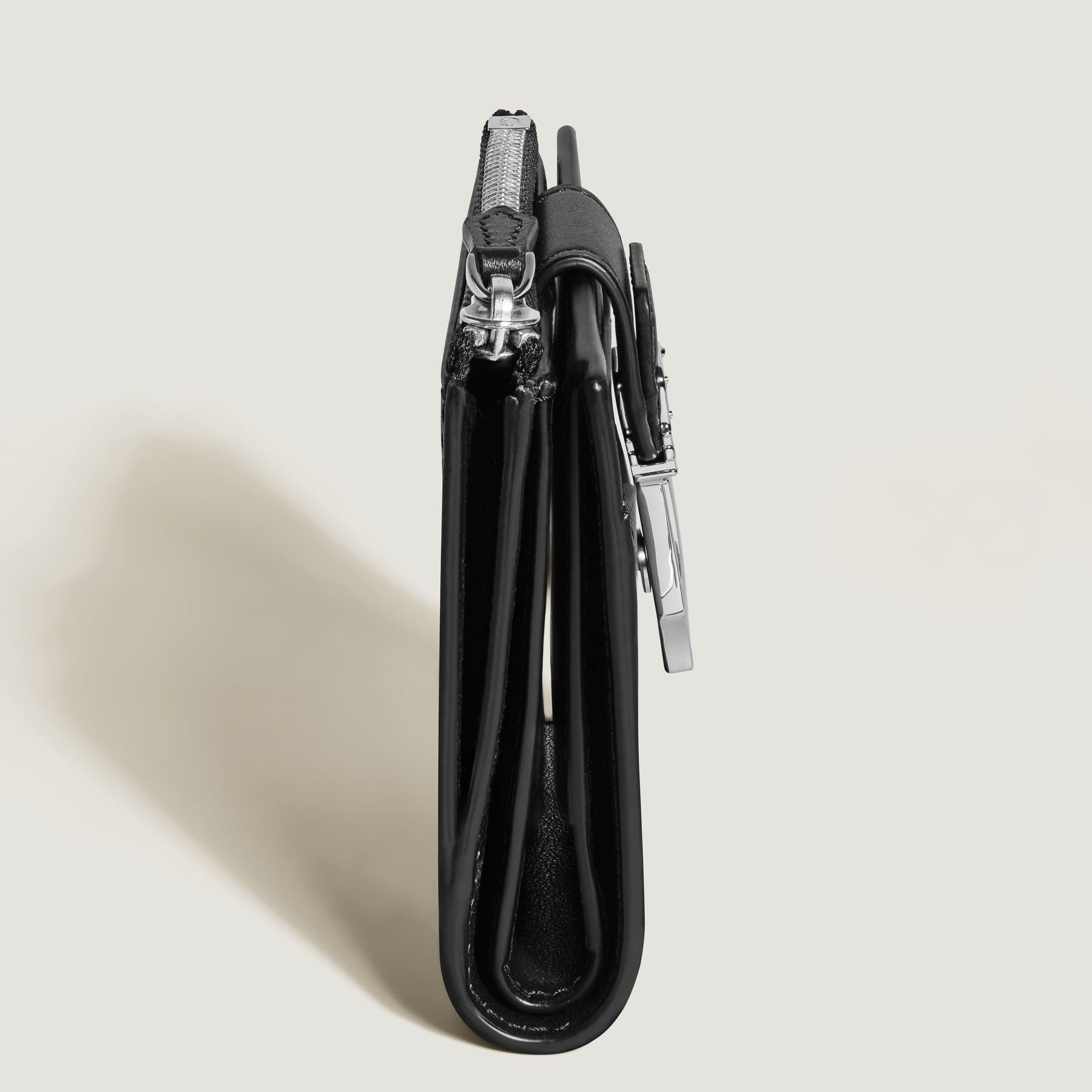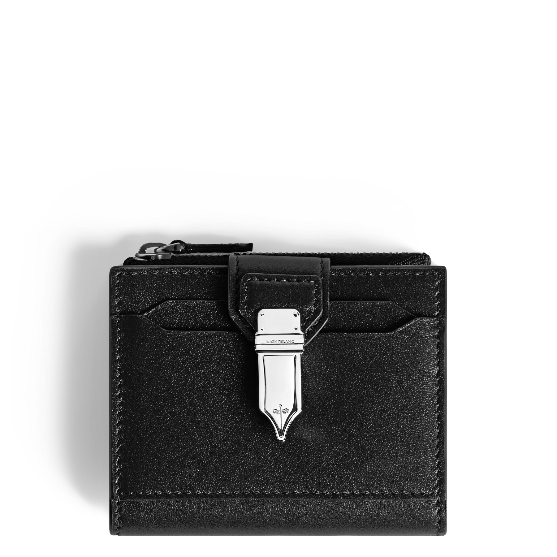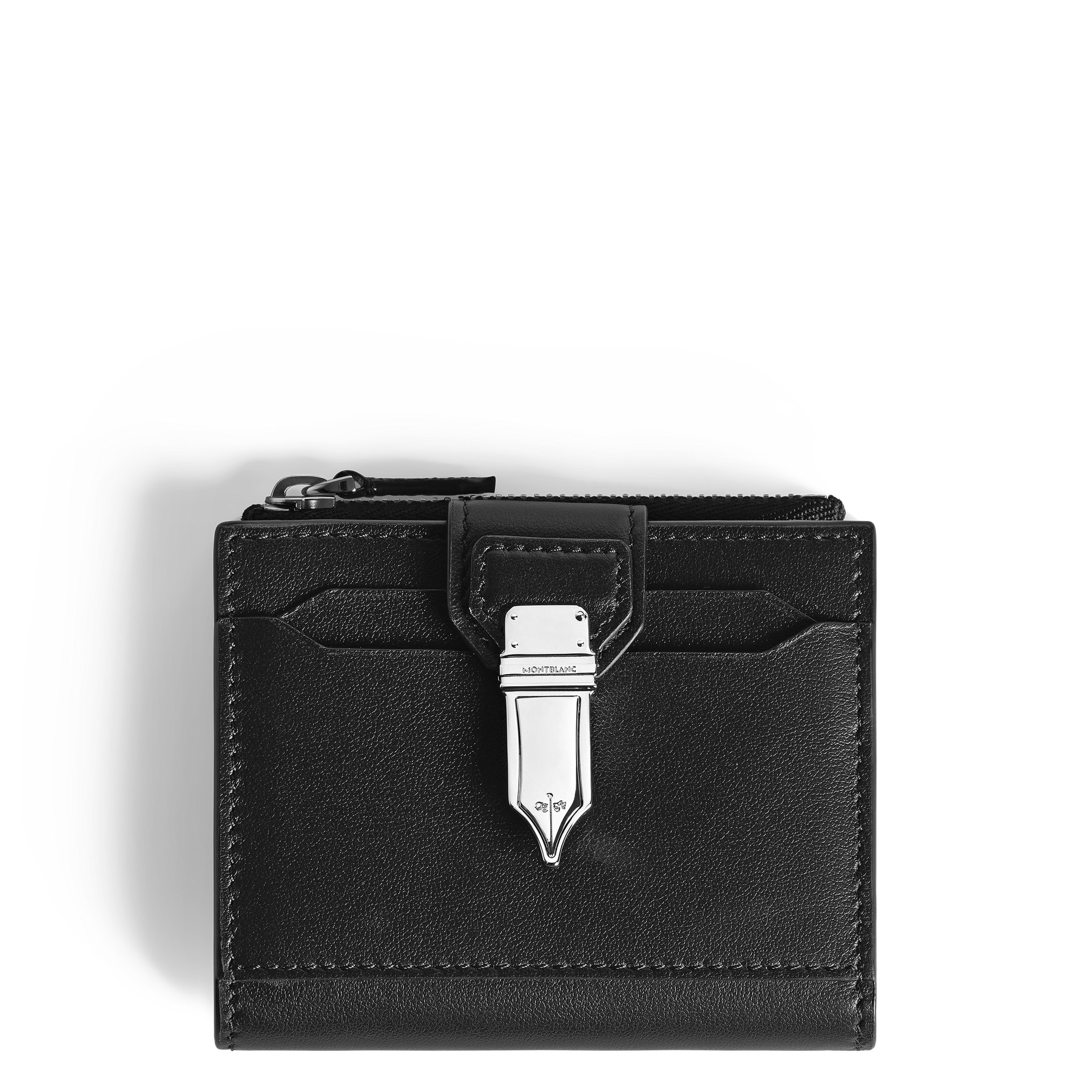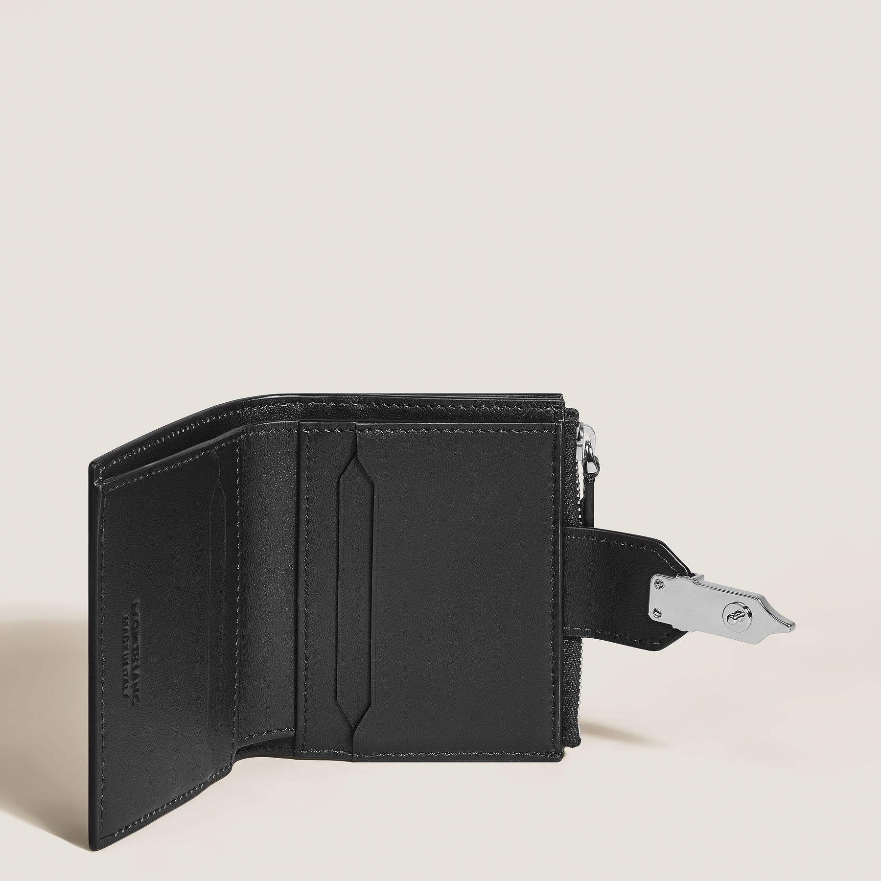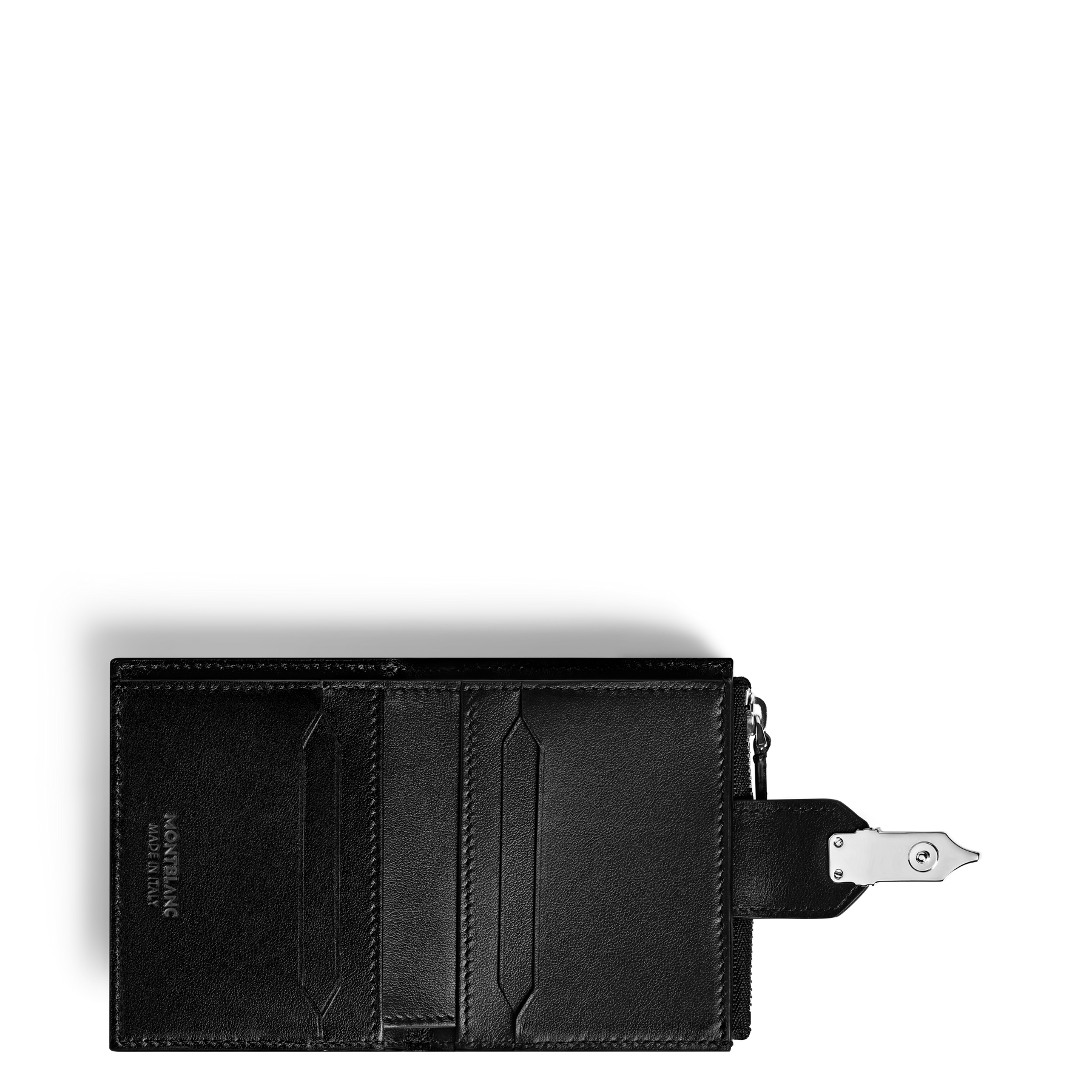 A rightful companion for daily use, this wallet boasts fits into every pocket. Crafted from soft black leather, it's accented with a unique, nib-shaped metal closure. Functional and stylish, it offers slots for six credit cards, a compartment for banknotes, a zipped pocket for coins, and two additional pockets for your convenience.