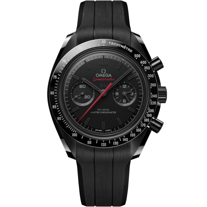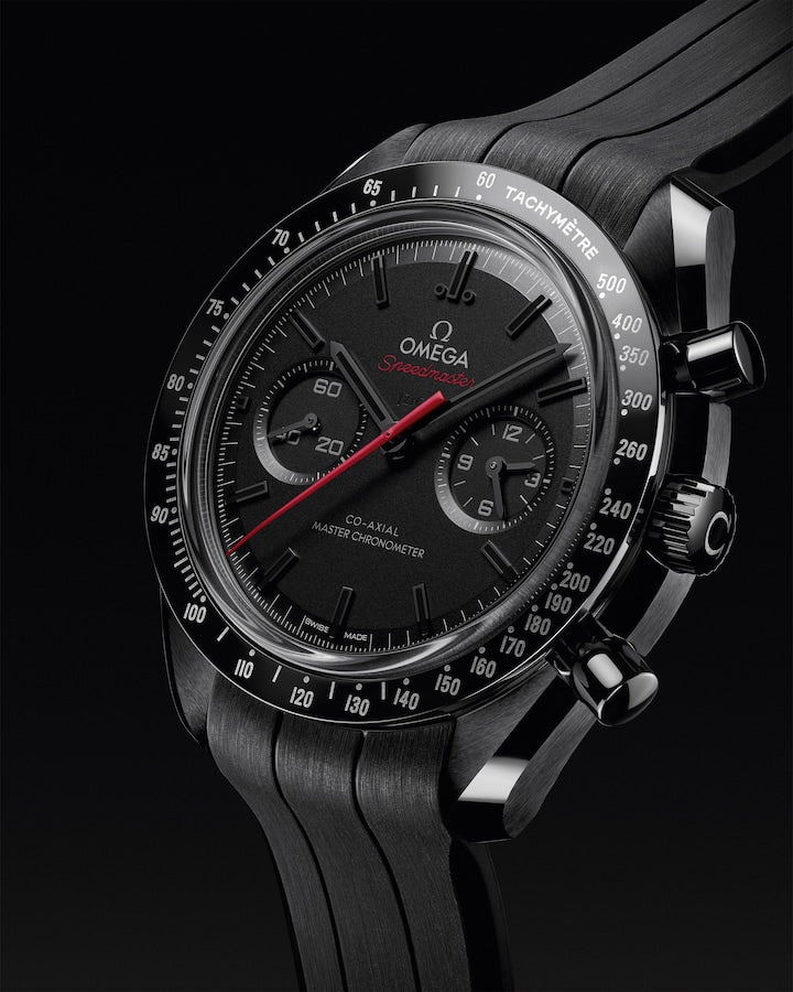 Honouring OMEGA’s legacy of space exploration, this Speedmaster Dark Side of the Moon features a 44.25 mm case in polished-brushed black ceramic. The polished bezel is also made from black ceramic and features a tachymeter scale in Liquidmetal™. Beneath the front sapphire crystal, the ceramic dial has been sand-blasted by laser and includes a small-seconds display at 9H, and a 60-minute and 12-hour recorder at 3H. The hour and minute hands, as well as the bevelled indexes, are all blackened and filled with black Super-LumiNova (green emission). The central chronograph hand is red varnished for a distinctive appearance. Visible through the caseback, OMEGA's manual-winding Co-Axial Master Chronometer Calibre 9908 has been given a special “black edition” finish, which includes a matte-blackened main plate and bridges, as well as black varnished engravings. The watch is worn on a black rubber strap with a lunar surface pattern on the underside, a ceramic foldover clasp, and ceramised titanium frame-spring folders.