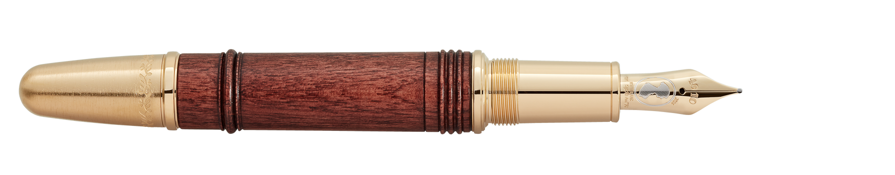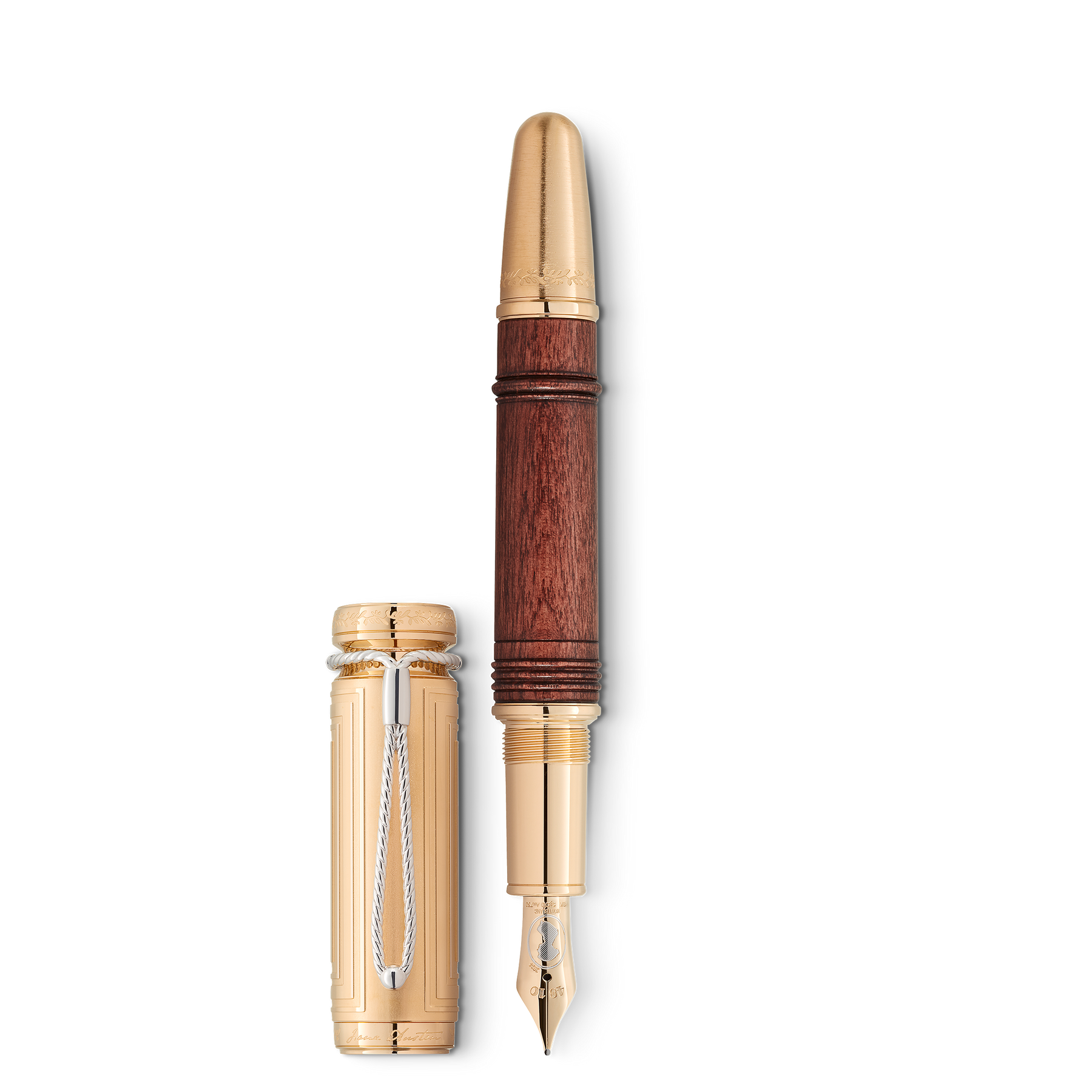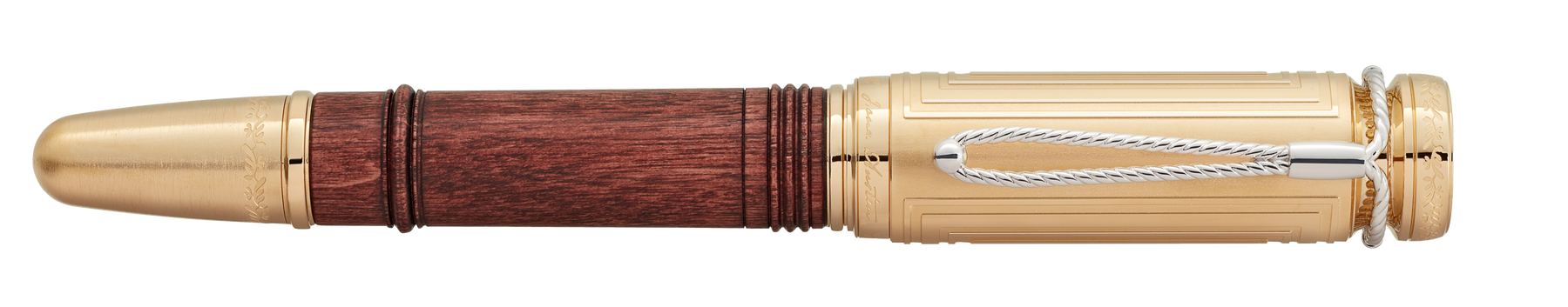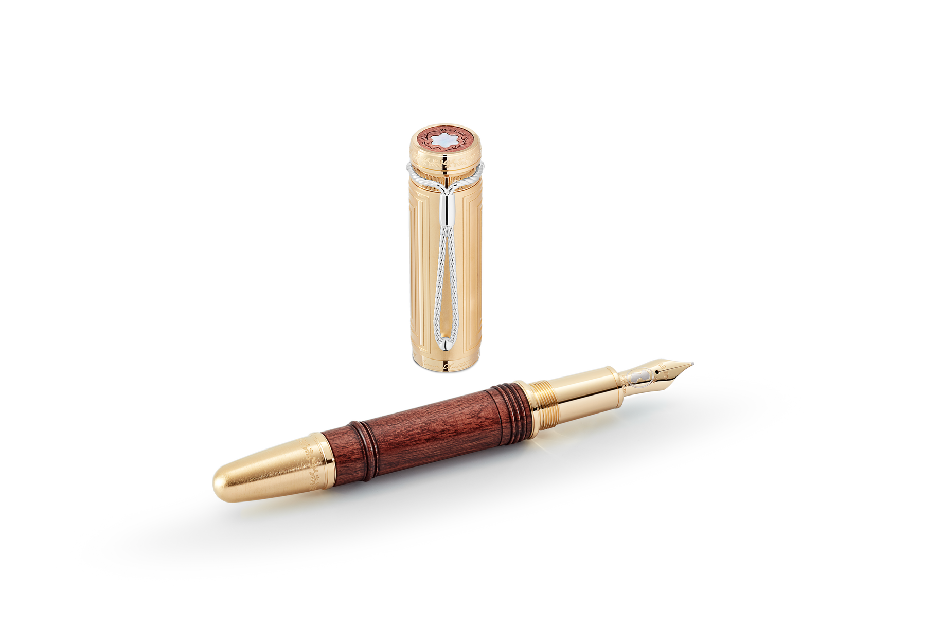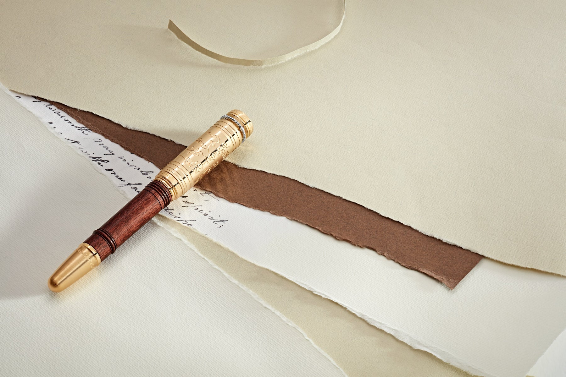 This edition transports us to the picturesque landscape of Hampshire, where, from 1809, Jane Austen found the quiet and inspiration she needed to be able to complete and publish her famous novels. Financially secure thanks to the generosity of her brother, she could dedicate herself fully to writing, literature and playing her cherished piano. Her delight at the beautiful square piano she purchased when she moved to her small cottage in Chawton inspired the design of the barrel, which is made of precious hornbeam wood. The gold-coated cap, whose design echoes the historic wall panelling and fireplace at Jane Austen’s home, harmonises beautifully with the barrel. In honour of what is probably Austen’s best-known novel, Pride and Prejudice, published in 1813, the cap ring is inscribed with the Roman numerals XXXIV. This number signifies the chapter in which the excessively proud Mr Darcy proposes to the wise and independent female protagonist, Elizabeth Bennet.
